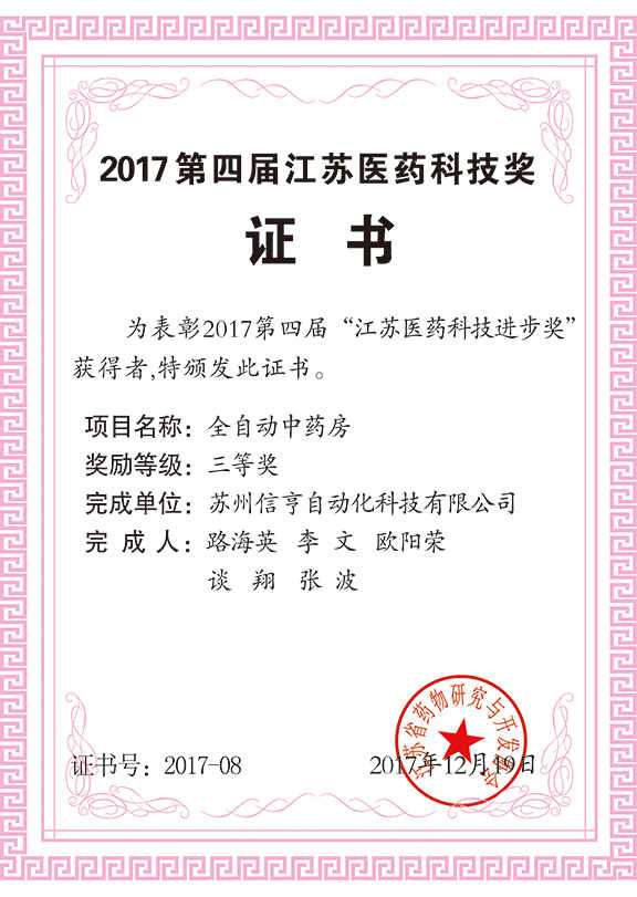 近日,第四届江苏医药科技奖正式揭晓。苏州信亨与南京市中医院、湖南中医药大学第一附属医院联合创新的袋装配方颗粒全自动中药房荣获“江苏医药科技进步奖”三等奖。